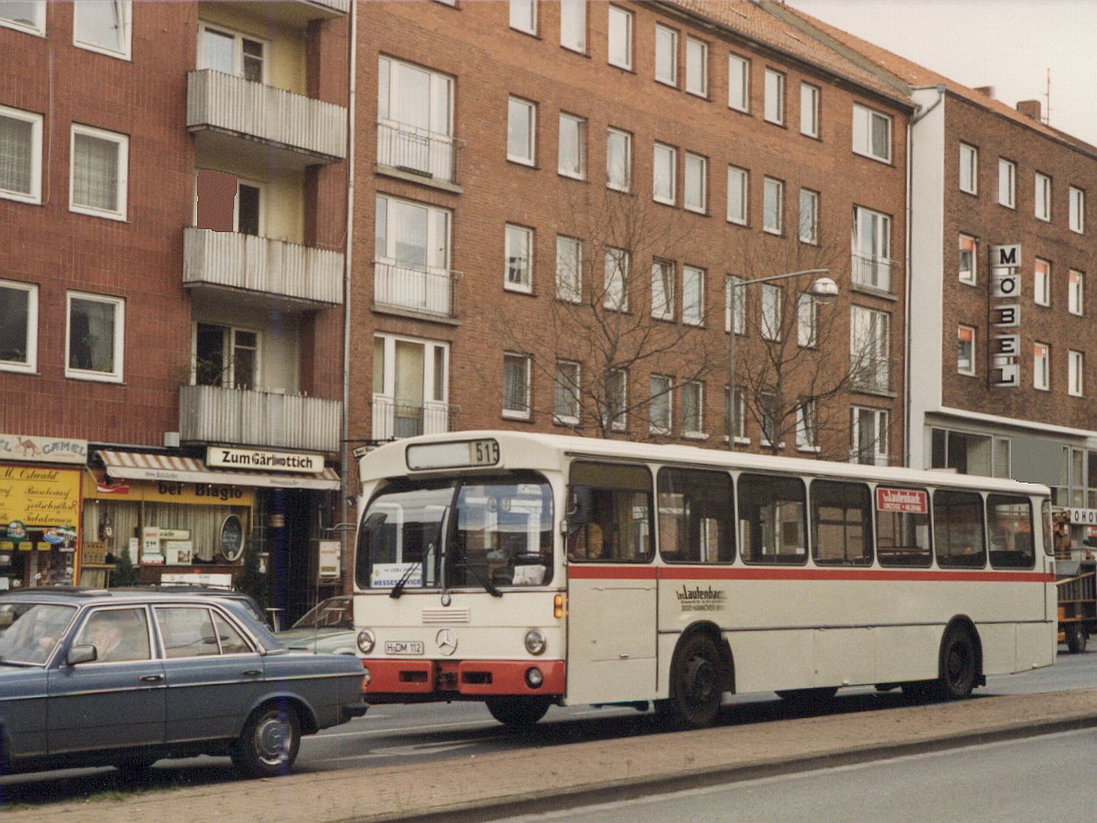 H-DM 112 im April 1989 an der Hildesheimer Straße, gegenüber der Brauerei. Interessant, dass hier die Linie 515 rein gedreht war.