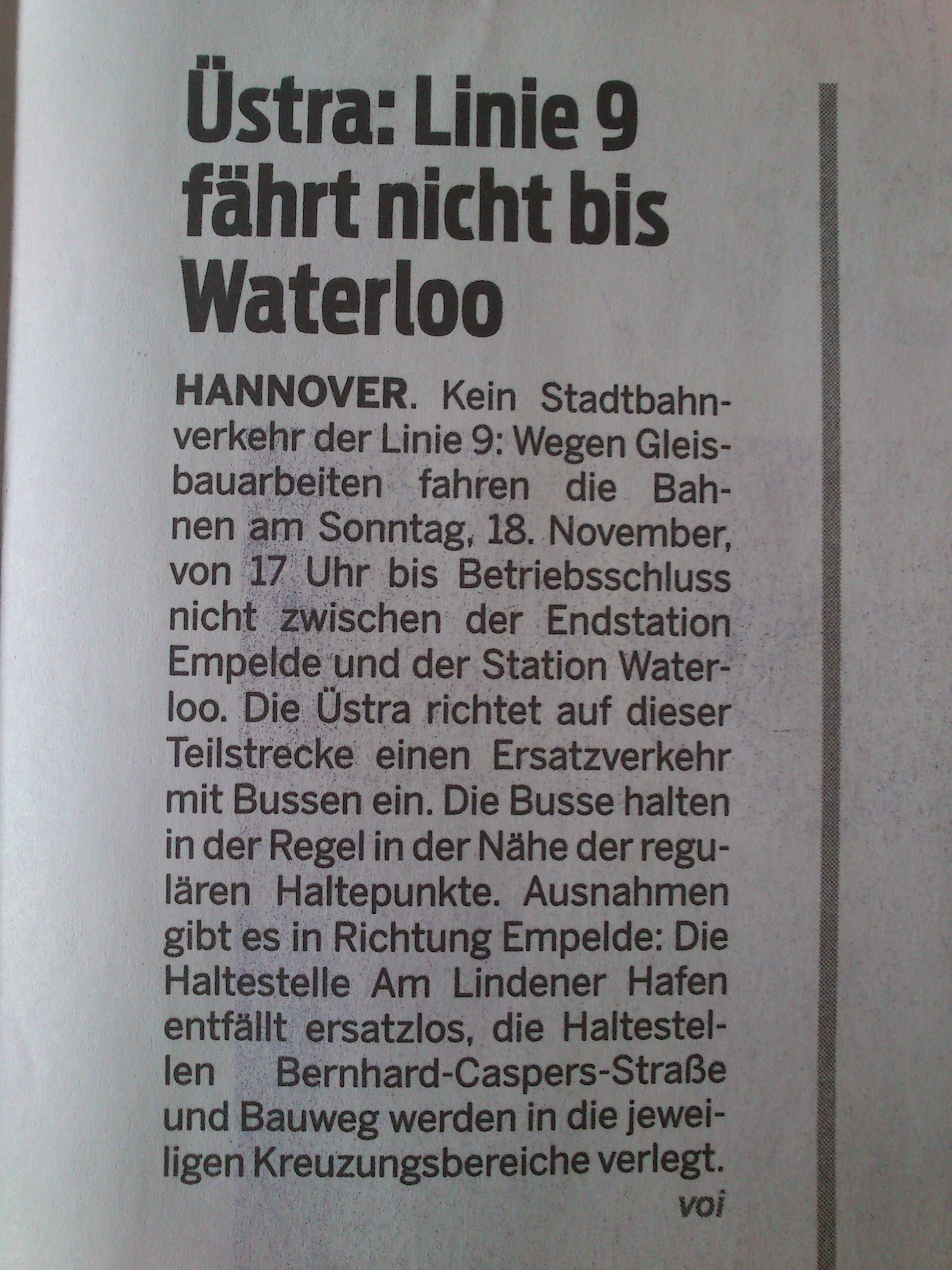 am Sonntag (morgen 18.11.12) findet ab 17 Uhr der hoffentlich letzte plam. SEV dieses Jahr für die Linie 9 statt. Grund ist, das die Bauweichen in der Davenstedter Straße entfernt werden und ab Montag 19.11.12 Betriebsbeginn wieder zweigleisig gefahren wird.